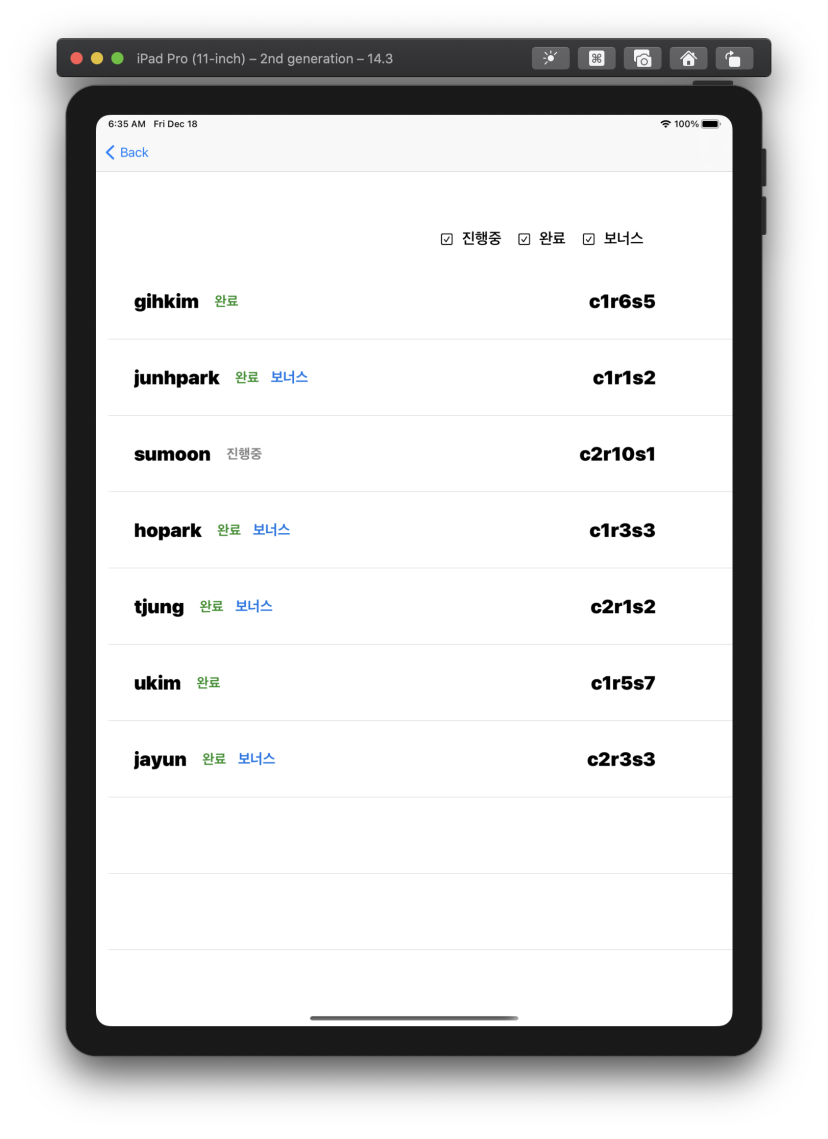 5. 우측 상단의 버튼을 클릭하면 현재 진행 중인 사람, 과제를 완료한 사람, 보너스 파트까지 완료한 사람으로 분류해서 목록을 띄워준다.