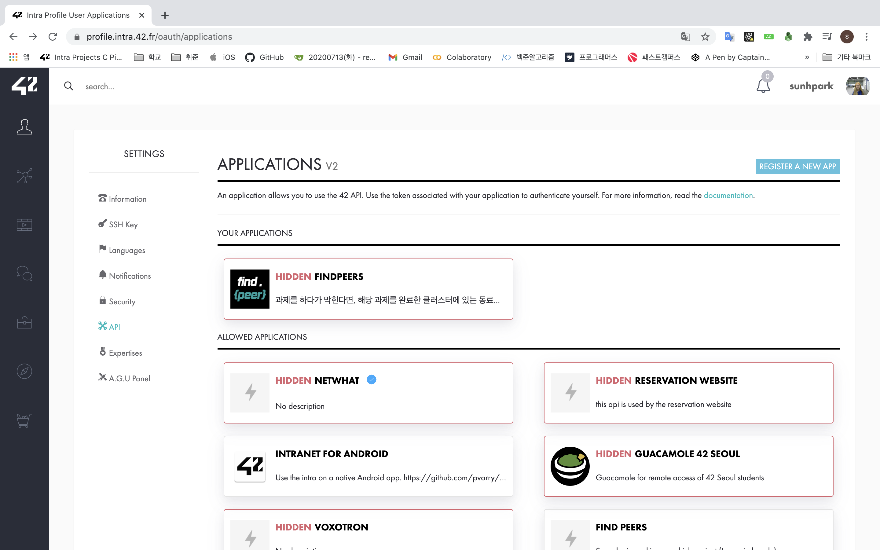 1. 42 intra > setting > API에서 앱 정보를 등록(Register a new App)하고 Client ID와 Secret key를 발급받는다.