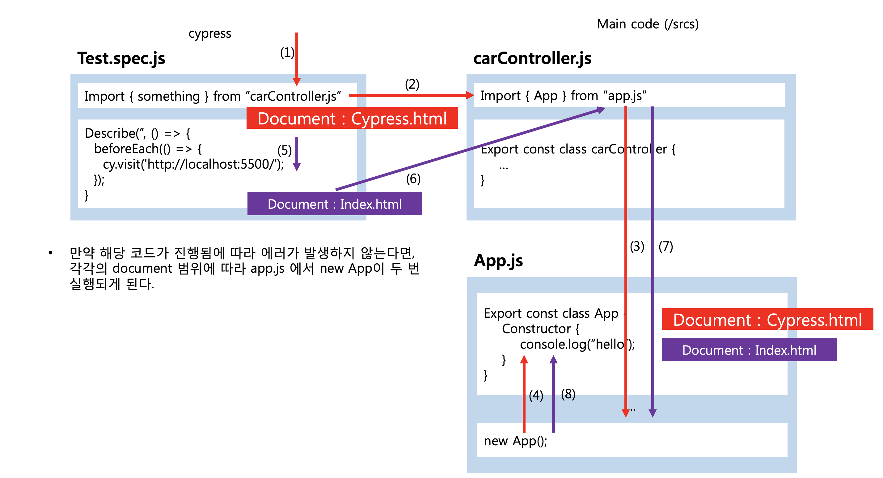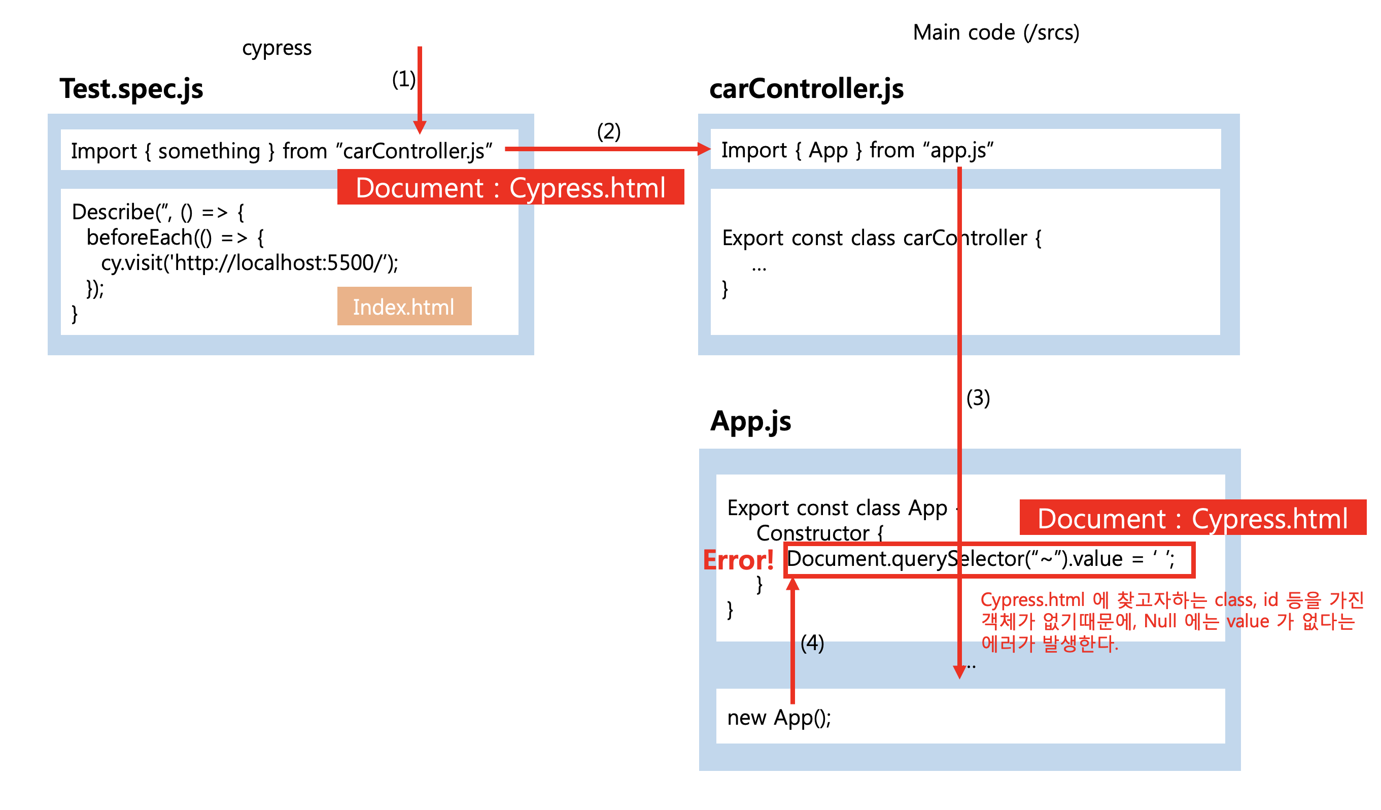 * 이번에 발생한 에러는 모듈을 import 해 오는 과정에서 app()을 실행시켜 유효하지 않은 document( cypress 자체의 html ) 을 참조한 것이 문제가 되었다.