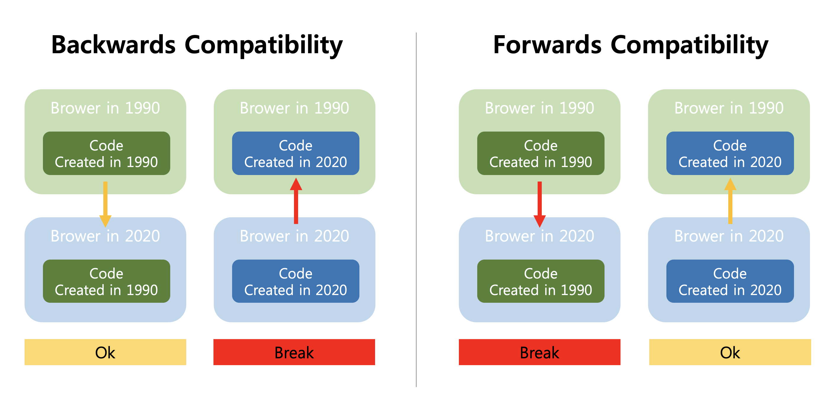 * Forwards Compatibility : 프로그램에 새 버전의 언어를 추가하는 것이 프로그램을 망가트리지는 않는다. 즉, 현재 작성된 코드가 과거의 브라우저에서 제대로 동작한다. (ex. Html, Css)