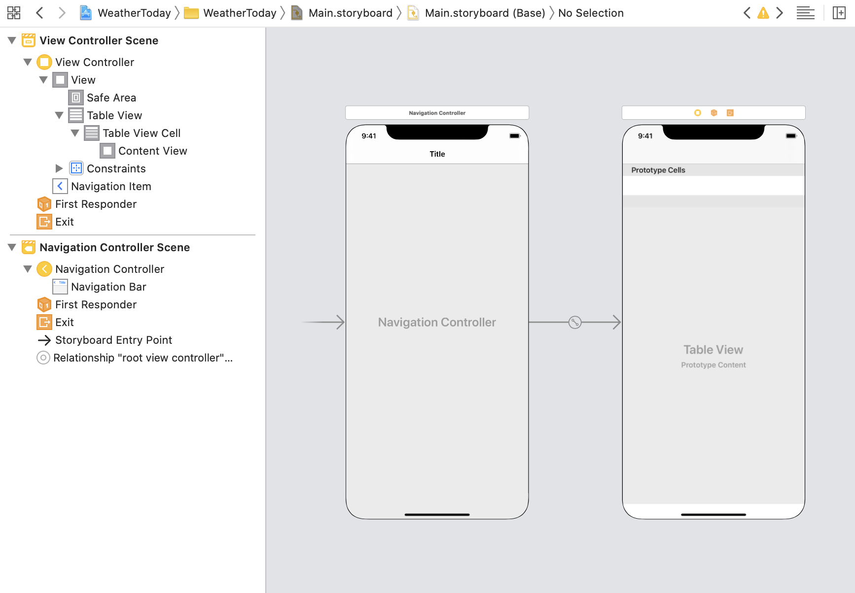그 다음으로는 테이블 뷰 컨트롤러는 메인 뷰에 삽입하고, cell을 추가해 주었다.