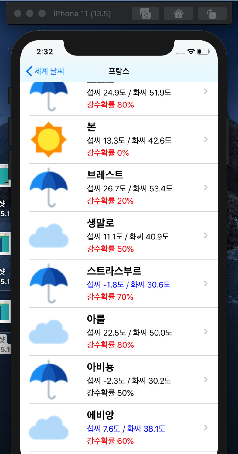 네비게이션 아이템의 타이틀은 국가이름, 테이블 뷰 셀은 날씨이미지, 도시명, 온도, 강수확률, 악세서리뷰 로 이루어져있다.